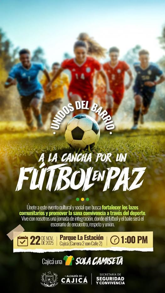 Este 22 de noviembre, desde la 1:00 p.m., te esperamos en el Parque La Estación para vivir una jornada llena de respeto, armonía y trabajo en equipo entre las barras sociales y la Administración Municipal, en el evento “Unidos del barrio a la cancha por un fútbol en paz”.