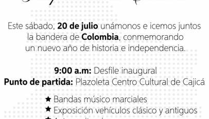 Conmemoremos juntos los 214 años de la Independencia de Colombia Sábado, 20 de julio de 2024 9:00 AM Plazoleta Centro Cultural de Cajicá #JuntosPorUnaCajicáIdeal