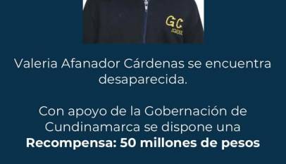 Valeria Afanador Cárdenas se encuentra desaparecida.Con apoyo de la Gobernación de Cundinamarca se dispone una recompensa de 50 millones de pesos.Si la ha visto o tiene información sobre su paradero, por favor comuníquese de inmediato a la línea de emergencia 123.
