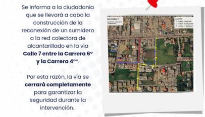 Se informa que el viernes 8 de noviembre de 2024, desde las 9:00 p.m. hasta las 3:00 a.m. del 9 de noviembre, se realizarán obras de reconexión de sumidero. La Calle 7 estará cerrada entre la Carrera 4° y la Carrera 6°. Ruta alterna: Calle 8. Agradecemos su comprensión y…