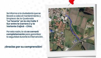 La Empresa de Servicios Públicos de Cajicá informa que el viernes 15 de noviembre de 2024, de 9:00 a.m. a 4:00 p.m., se llevará a cabo el mantenimiento y limpieza de la quebrada “La Tenería”. Por este motivo, se realizará el cierre total de la vía en la Calle 3…