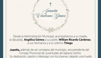 La Administración Municipal en cabeza de la Alcaldesa, Fabiola Jácome Rincón lamentan profundamente la pérdida de nuestra consejera de juventudes, Juanita Cárdenas Gómez. A su madre, la diputada Angélica Gómez, a su padre, Ricardo Cárdenas, a sus hermanos, familiares, amigos y demás conocidos, les enviamos un abrazo de condolencia y…