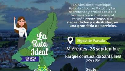 “La Ruta Ideal, 339 metas por Cajicá” estará en este sector. Fecha: 25 de septiembre de 2024 Hora: 2:30 p.m. Lugar: Parque Comunal Recuerden, esta es una estrategia que llegará a todos los sectores del municipio. ¡Los esperamos!