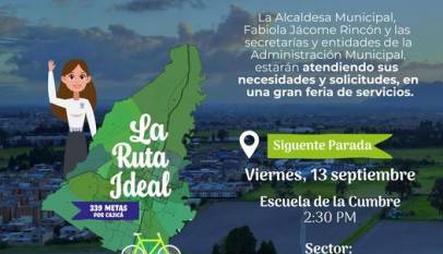 “La Ruta Ideal, 339 metas por Cajicá” estará en este sector. Fecha: 13 de septiembre de 2024. Hora: 2:30 p.m. Lugar: Escuela La Cumbre. Recuerden, esta es una estrategia que llegará a todos los sectores del municipio.