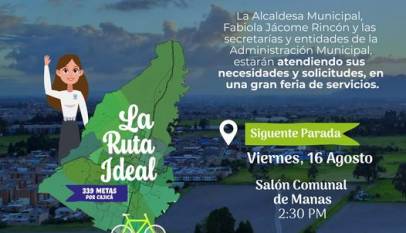 La Ruta Ideal, 339 metas por Cajicá”, estará en este sector. 16, agosto de 2024 2:30 PM Salón Comunal Manas Recuerden, ésta es una estrategia que llegará a todos los sectores del municipio.