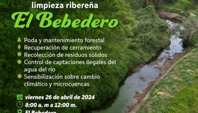 La Administración Municipal junto con la Empresa de Servicios Públicos de Cajicá, te invita a unirte a la Jornada Ambiental de Limpieza Ribereña. Viernes 26 de abril El Bebedero 8:00 a.m. Únete a este compromiso ambiental destinado a preservar las fuentes hídricas de nuestro municipio.
