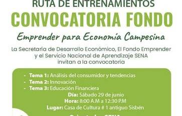 La Secretaría de Desarrollo Económico, el Fondo Emprender y el Servicio Nacional de Aprendizaje SENA, te invitan a la Convocatoria Fondo Emprender para la Economía Campesina. Fecha: Sábado 29 junio Lugar: Casa de la Cultura #1 antiguo Sisbén Fecha: Martes 02 julio Lugar: Centro Cultural y de Convenciones Fecha: Miércoles…