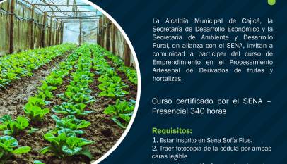 #CursoCertificado || ¿Quieres poner tu emprendimiento con derivados de frutas y hortalizas? La Administración Municipal de Cajicá te invita a participar del siguiente curso en alianza con el Sena. No olvides registrarte con la Secretaría de Desarrollo Económico en la Casa de la Cultura 1 o con la Secretaría de Ambiente…