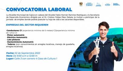 #Empleo || La Secretaría de Desarrollo Económico en alianza con Masivo Capita, te invitan a participar de la siguiente convocatoria laboral: Fecha: 2 de septiembre del 2022 Hora: De 9:00 a.m. a 12:00 m.. Lugar: Calle 4 #3-07 Casa de Cultura 1 #CajicáTejiendoFuturo #UnidosConTodaSeguridad #CajicáSiempreDiferente #SoyCajicá
