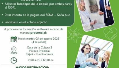 Modalidad: Presencial – 50 horasInicio: Jueves 14 de agosto de 2025Horario: 8:00 a.m. a 12:00 m.Lugar: Secretaría de Educación (Portal Interactivo) ¿Cómo inscribirse?Envíe al correo empleo@cajica.gov.co: Cédula en PDF Correo electrónico Número de celular Edad O acérquese a la Secretaría de Desarrollo Económico. Requisito: Estar inscrito en Sofía Plus. Cupos…