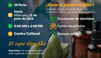 La Secretaría de Desarrollo Económico y el SENA invitan al curso sobre extracción, uso y aplicaciones de aceites esenciales. Duración: 40 horasInicio: miércoles, 11 de junioHorario: 8:00 a.m. a 2:00 p.m.Inscripciones: en las instalaciones de la Secretaría de Desarrollo Económico.