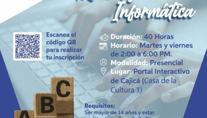 La Secretaría de Educación y el Sena invitan a participar en el curso de alfabetización informática. Martes y viernes 2:00 p.m. a 6:00 p.m. Duración 40 horas Portal Interactivo de Cajicá (Carrera 4#3-07, Casa de la Cultura 1, segundo piso) Inscríbete en el código QR o sigue este enlace: https://acortar.link/aeyoqS