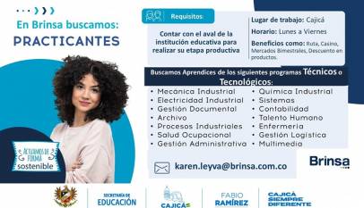 #Prácticas || La Secretaría de Educación de Cajicá invita a estudiantes de programas técnicos y tecnológicos a realizar sus prácticas académicas con la compañía BRINSA, por medio de vinculación por contrato por el SENA. Mayor información a través del correo: karen.leyva@brinsa.com.co #CajicáTejiendoFuturo #UnidosConTodaSeguridad