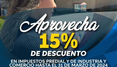 ¡Aprovecha el descuento del 15% en Impuesto Predial y de Industria y Comercio! Para incentivar y facilitar el cumplimiento oportuno, hemos establecido un descuento del 15% hasta el 31 de marzo de 2024.