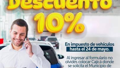La Secretaría de Hacienda informa que, hasta el próximo viernes 24 de mayo, los ciudadanos podrán aprovechar el descuento del 10% en el Impuesto de Vehículos de Cundinamarca. Recuerda que, al ingresar al formulario, debes indicar Cajicá en el campo correspondiente al municipio de residencia.