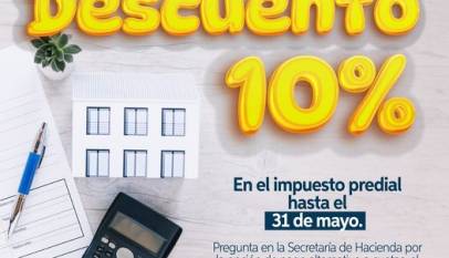 ¡Aprovecha el 10% de descuento en el Impuesto Predial! Fecha límite para el pago con descuento: 31 de mayo de 2024. Pregunta por la opción de pago alternativo en cuotas.