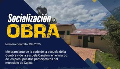 En el marco de los presupuestos participativos, se socializarán las obras de mejoramiento de las sedes Escuela La Cumbre y Escuela Canelón. Conozca todos los detalles de estos proyectos que beneficiarán a la comunidad. Jueves, 26 de marzo de 20266:00 p. m.Escuela La Cumbre Su participación es muy importante.