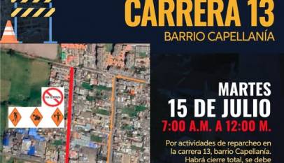 La Secretaría de Infraestructura y Obras Públicas informa a la comunidad que se llevará a cabo mantenimiento vial en la carrera 13, en el barrio Capellanía. Agradecemos a la comunidad por su comprensión y recomendamos tomar rutas alternas.