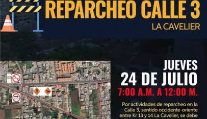 La Secretaría de Infraestructura y Obras Públicas informa a la comunidad que se llevará a cabo mantenimiento vial en la calle 3, en la avenida Cavelier. Agradecemos la comprensión de todos y recomendamos tomar rutas alternas mientras se desarrollan los trabajos.