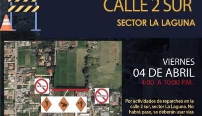 La Secretaría de Infraestructura y Obras Públicas informa a la comunidad que se está llevando a cabo el mantenimiento de la vía en la Calle 2 Sur, sector La Laguna. Agradecemos la comprensión de los ciudadanos y recomendamos tomar rutas alternas mientras se desarrollan las labores.