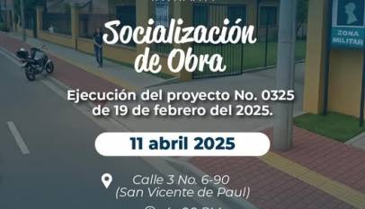Invitamos a la comunidad a participar en la jornada de socialización de la ejecución del proyecto No. 0325. Fecha: viernes 11 de abril de 2025Hora: 4:00 p.m.Lugar: San Vicente de Paul Avanzamos en el cumplimiento de la meta 58 del PDM, Cajicá Ideal.Conozca los detalles de este proyecto que beneficiará…