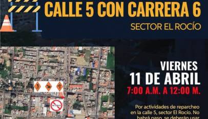 La Secretaría de Infraestructura y Obras Públicas informa que se están realizando labores de mantenimiento en la calle 5 con carrera 6, sector El Rocío. Agradecemos a la comunidad por su comprensión y recomendamos tomar rutas alternas mientras se desarrollan los trabajos.