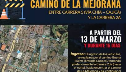 La Secretaría de Infraestructura y Obras Públicas informa que, desde el martes 1 hasta el viernes 4 de abril de 2025, se realizará un cierre parcial en el sector El Molino, en la vía Cajicá – Tabio. Horario: de 9:00 p. m. a 2:00 a. m.Durante la jornada se habilitará el paso…