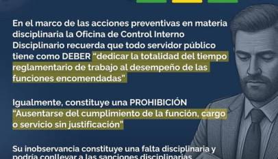 En el marco de las acciones preventivas en materia disciplinaria, se recuerda a los servidores públicos la importancia de dedicar la totalidad del tiempo reglamentario al cumplimiento de sus funciones. Ausentarse sin justificación constituye una prohibición y puede derivar en sanciones disciplinarias conforme a la normativa vigente. Cumplir con las…