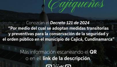Por medio del cual se adoptan medidas transitorias y preventivas para conservación de la seguridad y el orden público en el municipio de Cajicá. Decreto completo en el código QR de la imagen o el siguiente enlace: https://www.cajica.gov.co/…/DECRETO%20121%20DEL%2028…