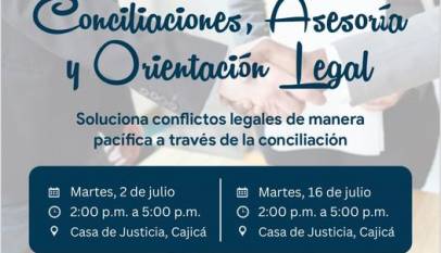 Se acerca la jornada de “Conciliaciones, Asesoría y Orientación Legal”, una estrategia de la Casa de Justicia Cajicá. Contaremos con la presencia del Centro de Conciliación y Arbitraje Auxilio Jurídico, brindando asesoría legal y orientación a todos los ciudadanos. Martes 2 y 16 de julio 2:00 p.m. a 5:00 p.m.…