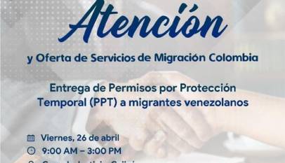 La Secretaría de Gobierno y Participación Ciudadana invita a la comunidad en general y población migrante a participar en la Jornada de atención y oferta de servicios de Migración Colombia. Asesoría en materia migratoria y entrega de permisos por protección temporal – PPT a migrantes venezolanos Viernes 26 de abril…