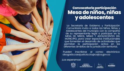#Convocatoria ll ¡Ven y participa de la Mesa de niños, niñas y adolescentes! La Secretaría de Gobierno y Participación Comunitaria invita a todos los niños a participar activamente de espacios institucionales que fomenten el desarrollo en el ámbito de la jurisdicción territorial. Pueden inscribirse al correo electrónico: abogado.casajesticia.cto@cajica.gov.co ¡Los esperamos!…
