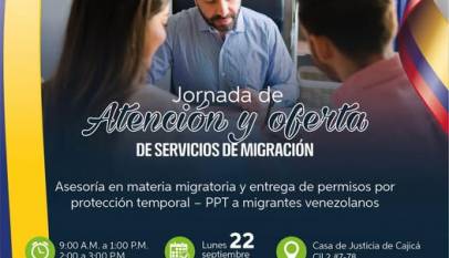 Participe en la jornada de atención y oferta de servicios de Migración Colombia, dirigida a la comunidad en general y población migrante. Podrá recibir: Asesoría en trámites migratorios Entrega de Permisos por Protección Temporal (PPT) para migrantes venezolanos Importante Atención por orden de llegada Servicio gratuito Detalles del evento Fecha:…