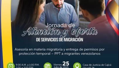 Durante esta jornada podrá recibir: Asesoría en trámites migratorios Entrega de Permisos por Protección Temporal (PPT) para migrantes venezolanos Importante: Atención por orden de llegada Servicio gratuito Fecha: Viernes, 25 de julio de 2025Hora: 9:00 a. m. a 1:00 p. m. / 2:00 p. m. a 3:00 p. m.Lugar: Casa…