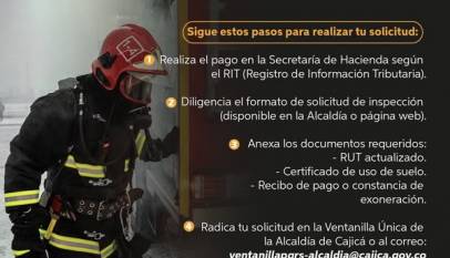 ¿Necesita el visto bueno del Cuerpo Oficial de Bomberos para su establecimiento? En Cajicá puede hacerlo de manera fácil siguiendo estos pasos: Realice el pago según el RIT. Diligencie el formulario correspondiente. Adjunte los documentos requeridos. Radique la solicitud. Importante:Si se generan observaciones, tendrá 30 días para realizar los ajustes.…