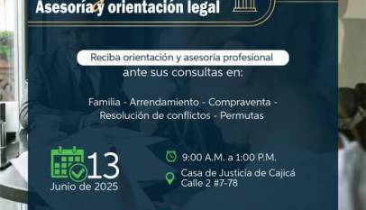 La Secretaría de Gobierno y Participación Ciudadana, junto con la Casa de Justicia y el apoyo de la Fundación Armonía Sabana Norte, invita a la comunidad a participar en las jornadas especiales de asesoría jurídica sin costo. Podrá recibir orientación profesional en temas como: Derecho civil Derecho de familia Insolvencias…