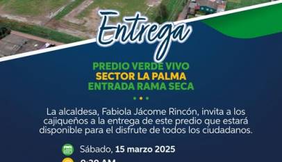 La Administración Municipal, en cabeza de la alcaldesa Fabiola Jácome, invita a toda la comunidad a participar en la entrega de este espacio, destinado para el disfrute de los ciudadanos. Fecha: 15 de marzo de 2025Hora: 9:30 a. m.Lugar: Entrada Rama Seca – sector La Palma Los esperamos.