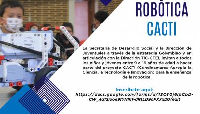 #Inscríbete ll La Secretaría de Desarrollo Social y la Dirección de Juventudes a través de la estrategia Golombiao y en articulación con la Dirección TIC-CTEI, invitan a todos los niños y jóvenes entre 9 a 16 años de edad a hacer parte del proyecto CACTI (Cundinamarca Apropia la Ciencia, la…