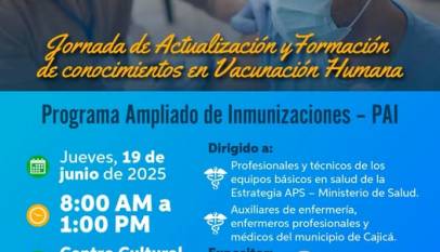 Participe en la Jornada de Actualización y Formación en Vacunación Humana del Programa Ampliado de Inmunizaciones – PAI, un espacio para fortalecer conocimientos y capacidades del talento humano en salud. Dirigido a: Profesionales y técnicos de los equipos APS Auxiliares de enfermería, enfermeros profesionales y médicos del municipio Fecha: Jueves,…