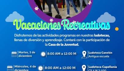 Nuestros niños, niñas y adolescentes podrán disfrutar de las diferentes actividades organizadas por las Ludotecas y la Casa de la Juventud para estas vacaciones. Martes, 3 de diciembre Horario: 8:00 AM a 12:00 M Lugar: Ludoteca Canelón, Antigua Escuela Miércoles, 4 de diciembre Horario: 8:00 AM a 12:00 M Lugar:…