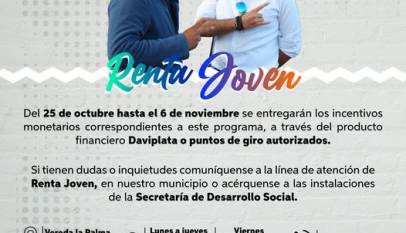 Los jóvenes beneficiarios del programa del departamento de Prosperidad Social ‘Renta Joven’ podrán realizar su retiro correspondiente en los puntos de giro autorizados y DaviPlata. La Secretaría de Desarrollo Social, a través de la Dirección de Infancia y Juventud, seguirá velando por los beneficios para nuestra comunidad. Meta: 88 del…