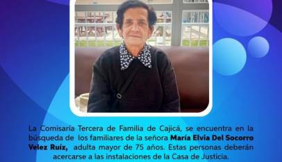 La Comisaría Tercera de Familia se encuentra en la búsqueda de los familiares de la señora María Elvia Del Socorro Vélez Ruíz. Es importante que se contacten o asistan a las instalaciones de la comisaría en la Casa de Justicia, Calle 2 #7-78. Para más información, comuníquese al 318 520…