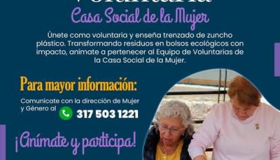 La Casa Social de la Mujer, en alianza con la CAR, busca una voluntaria con conocimientos en trenzado de zuncho plástico para liderar el taller de creación de bolsos ecológicos. Avanzando con la meta 105 del PDM, Cajicá Ideal.Es una oportunidad para compartir talento, fomentar el aprovechamiento de residuos y…