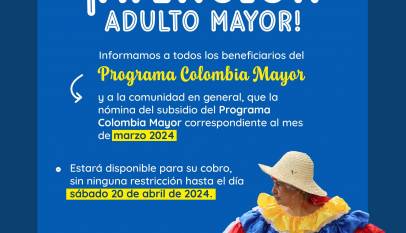 La Secretaría de Desarrollo Social informa a los adultos mayores beneficiarios del Programa Colombia Mayor, que la nómina del subsidio correspondiente al mes de marzo, estará disponible para su cobro hasta el sábado 20 de abril de 2024. Tenga en cuenta además el valor y los puntos autorizados para su…