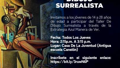 #TallerSurrealista ll La Secretaría de Desarrollo Social, la Dirección de Infancia y Juventud a través de la estrategia Azul Manera de Ver invitan a los jóvenes a participar del Taller de Dibujo Surrealista. Fecha: Todos los jueves. Hora: 2:15p.m. a 3:15p.m. Lugar: Casa de la Juventud (Antigua escuela Canelón) Inscríbete…
