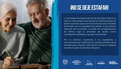 #NoSeDejeEstafar ll Personas inescrupulosas se están haciendo pasar por funcionarios de la Alcaldía y del Programa Adulto Mayor para ofrecer supuestas ayudas humanitarias. Tenga cuidado y no se deje engañar, verifique los contactos oficiales de la Administración Municipal y la Secretaría de Desarrollo Social. #CajicáTejiendoFuturo #UnidosConTodaSeguridad