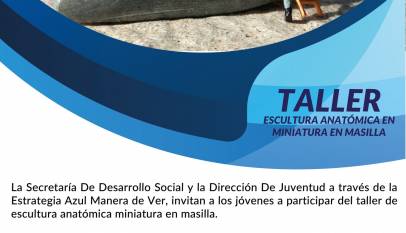 #TallerDeEscultura ll La Secretaría De Desarrollo Social junto a la Dirección De Juventudes a través de la estrategia “Azul Manera de Ver” invitan a todos los jóvenes a participar del taller de escultura anatómica miniatura en masilla. Día: Miércoles 6 de julio de 2022 Hora: 2:00 p.m. Lugar: Casa de…