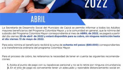 #SubsudioNómina ll La Secretaría de Desarrollo Social del Municipio de Cajicá se permite informar a todos los adultos mayores beneficiarios del Programa Colombia Mayor y a la comunidad en general, que la nómina correspondiente al mes de ABRIL, estará disponible sin ninguna restricción hasta el día viernes 13 de mayo…