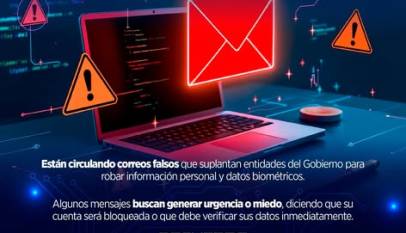 Se han identificado correos fraudulentos que suplantan entidades del Gobierno para engañar a los ciudadanos y obtener información personal o datos biométricos. Recuerde:No comparta contraseñas.No ingrese a enlaces sospechosos.No envíe fotos o datos personales. Proteja su información y manténgase alerta ante posibles fraudes digitales.