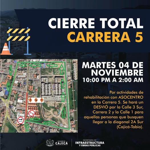 La Secretaría de Infraestructura y Obras Públicas informa a la comunidad que se llevarán a cabo actividades de rehabilitación vial. Por tal motivo, se realizará el cierre total de la vía el martes 4 de noviembre de 2025, desde las 10:00 p. m. hasta las 2:00 a. m.